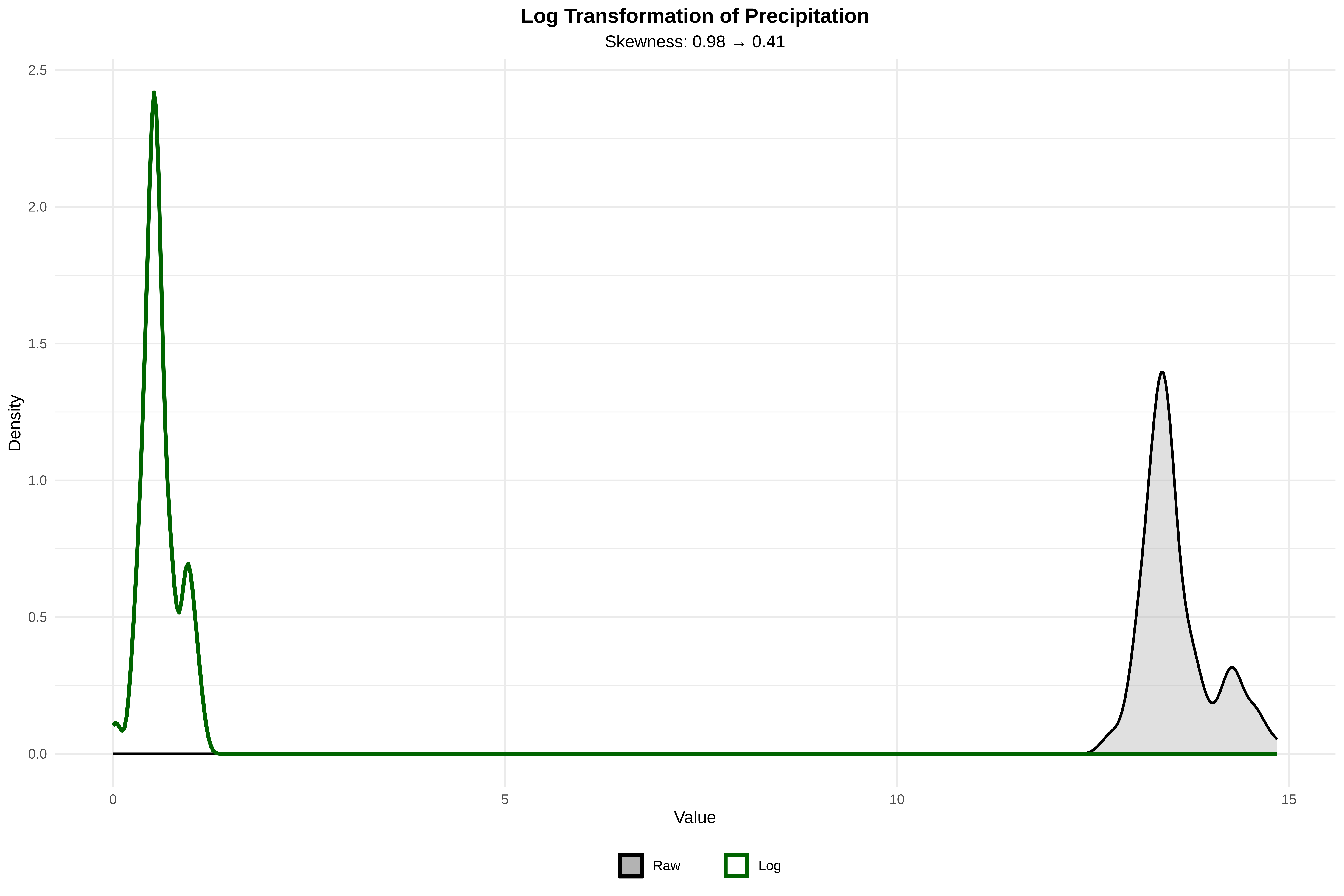 • Log precipitation: Skewness 0.98 → 0.41 ✓ (improved)