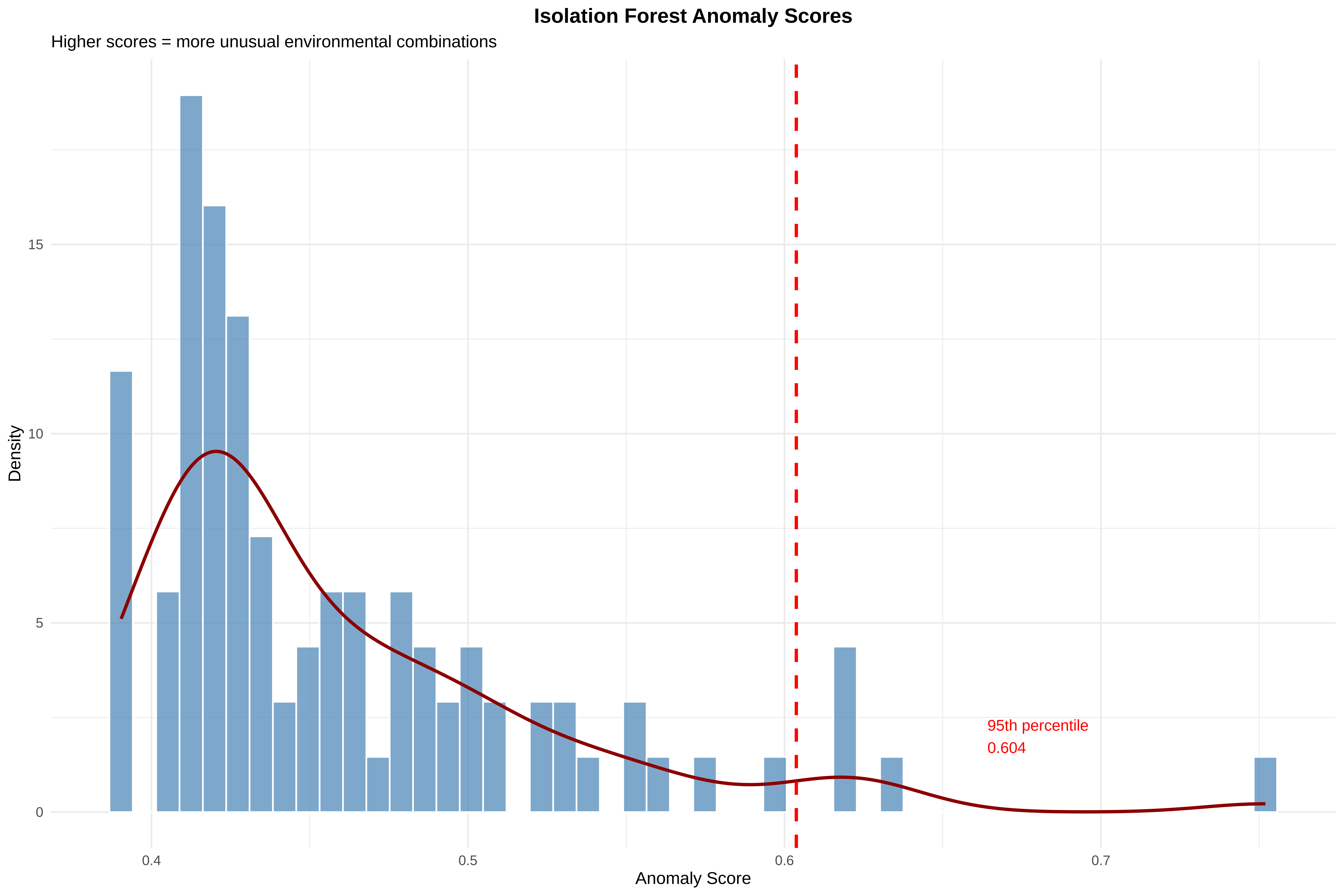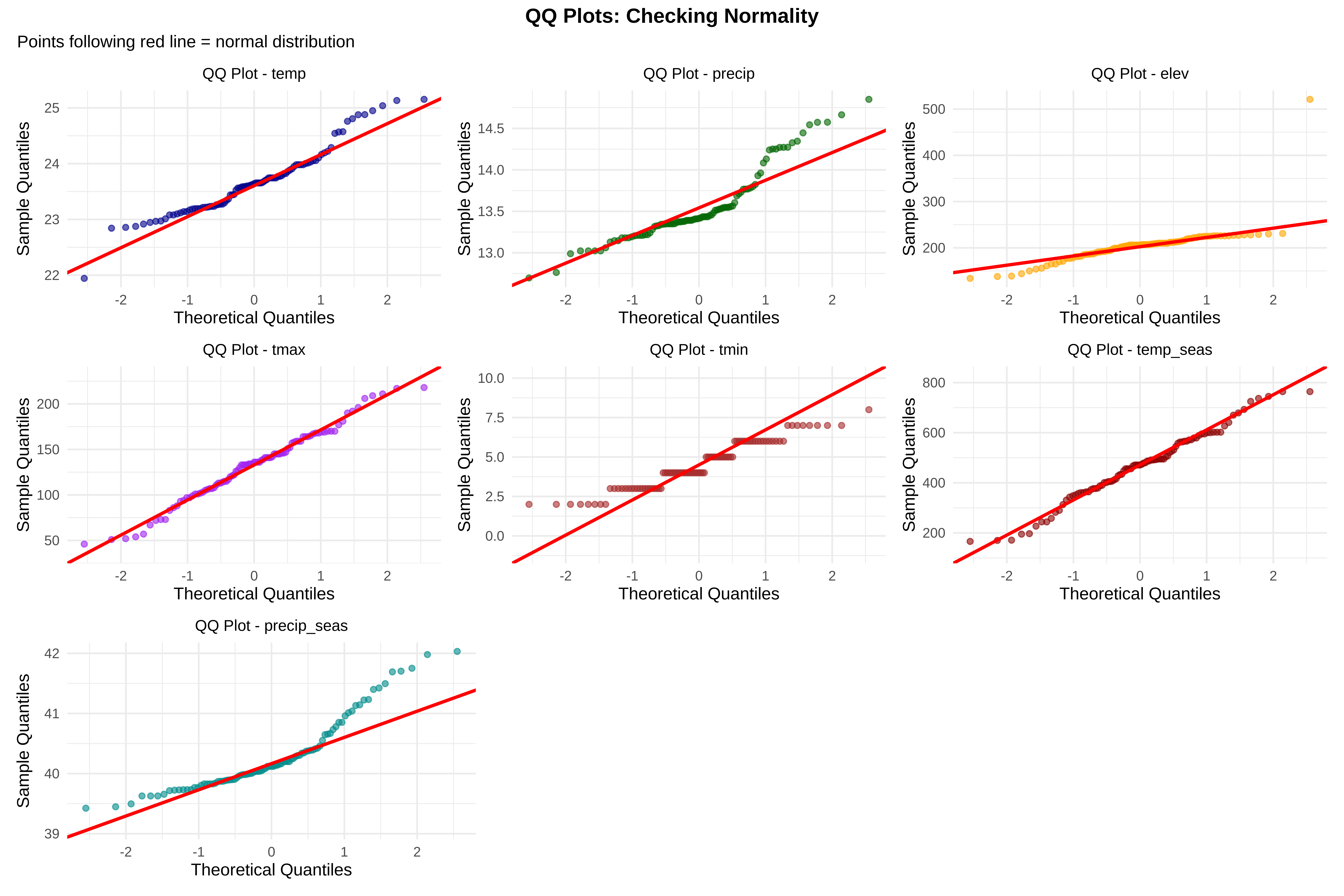 # ==============================================================================# SUMMARY: KEY INTERPRETATIONS# ==============================================================================cat("\n", paste(rep("=", 70), collapse =""), "\n")cat("SESSION 2 SUMMARY: KEY INTERPRETATIONS\n")cat(paste(rep("=", 70), collapse =""), "\n\n")cat("1. DISTRIBUTION DIAGNOSTICS:\n")cat(" • Look at histograms: Are they symmetric? Skewed? Multi-modal?\n")cat(" • QQ plots: Do points follow the line? Deviations at ends = heavy tails\n")cat(" • Boxplots: Points beyond whiskers are potential outliers\n\n")cat("2. TRANSFORMATIONS:\n")cat(" • Log transformation: Use when relationship is multiplicative\n")cat(" (e.g., species richness increases by % with productivity)\n")cat(" • Z-score: Use to compare effect sizes across different scales\n")cat(" (e.g., is temperature or precipitation more important?)\n\n")cat("3. OUTLIERS:\n")cat(" • Statistical outliers: Points with high anomaly scores\n")cat(" • But ask: Are these sensor errors? Rare habitats? True extremes?\n")cat(" • Don't auto-delete! Check maps and metadata first\n\n")cat("4. MULTICOLLINEARITY:\n")cat(" • High correlations (>0.7) between predictors cause problems\n")cat(" • Need to address in Session 3 with regularization or variable selection\n\n")cat("5. NEXT STEPS:\n")cat(" • Session 3 will use this clean data for collinearity & regularization\n")cat(" • File saved: spider_data_clean.csv has all transformed variables\n")cat(paste(rep("=", 70), collapse =""), "\n")