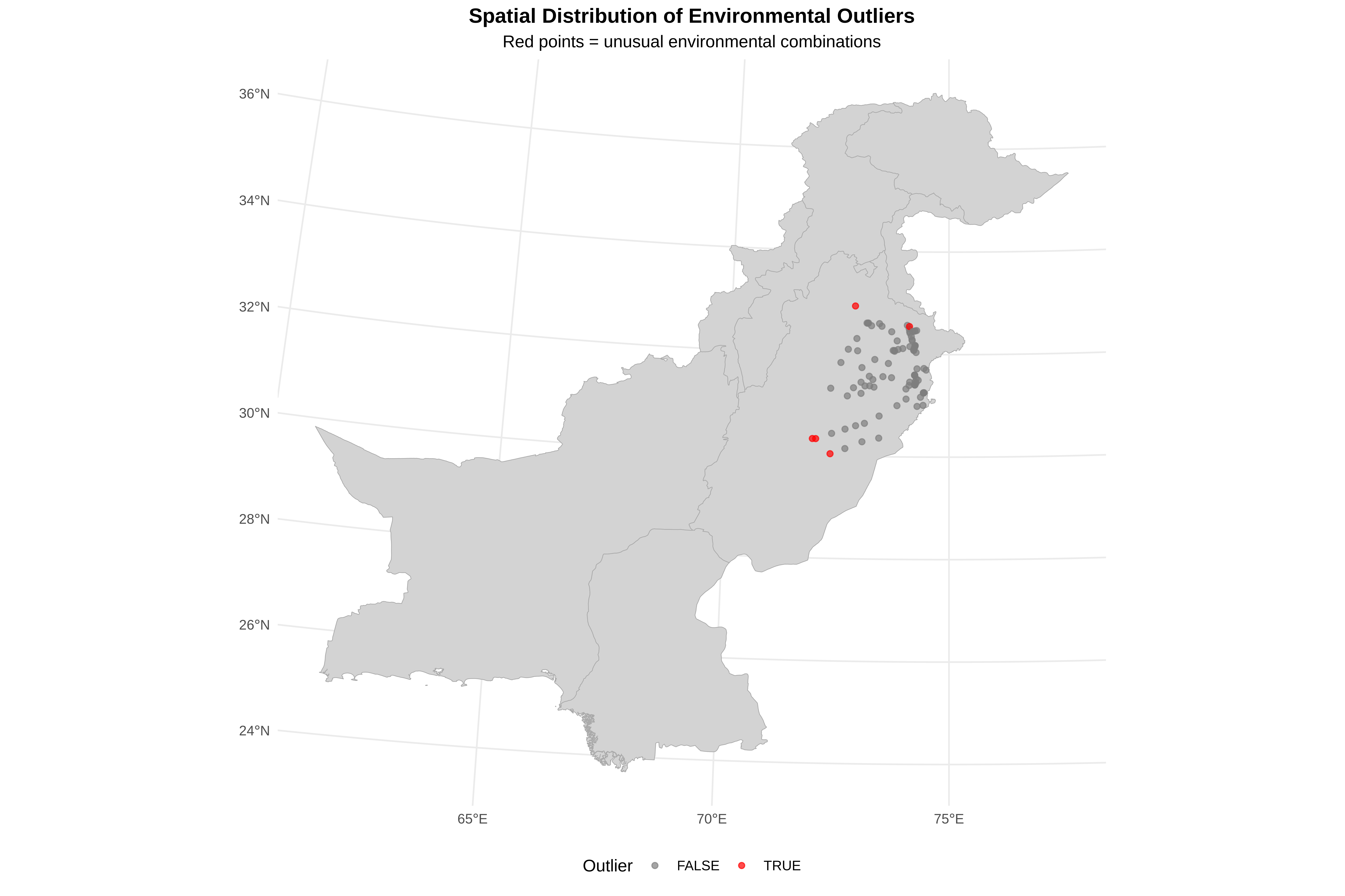 cat("\n=== CREATING FINAL CLEAN DATASET ===\n")cat("Save a clean version with transformed variables for Session 3\n")# Create final dataset with original and transformed variablesfinal_data <- data_clean %>% dplyr::select(# Coordinates X, Y, x, y,# Original climate variables temp, precip, elev, tmax, tmin, temp_seas, precip_seas,# Transformed versions log_precip, temp_z, precip_z, elev_z,# Outlier information anomaly_score, is_outlier )# Save as CSVwrite.csv(final_data, "/run/media/tahirali/Expansion/github/spatial-ecology-workshop/data/spider_data_clean.csv",row.names =FALSE)cat("✓ Clean dataset saved to: /run/media/tahirali/Expansion/github/spatial-ecology-workshop/data/spider_data_clean.csv\n")cat(" This file contains original variables + transformed versions + outlier flags\n")