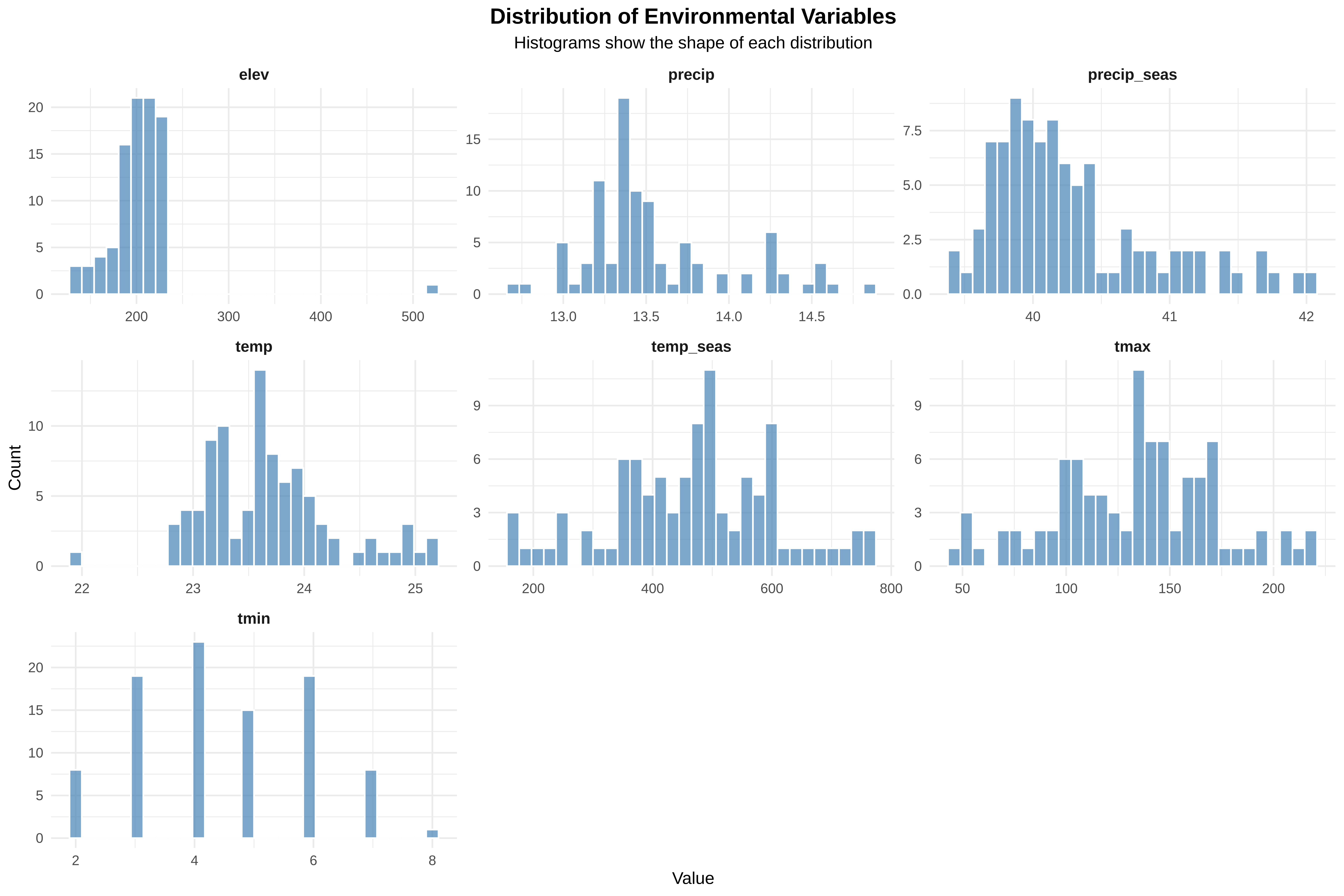 Before building species distribution models, we must understand the structure of environmental predictors. This includes: