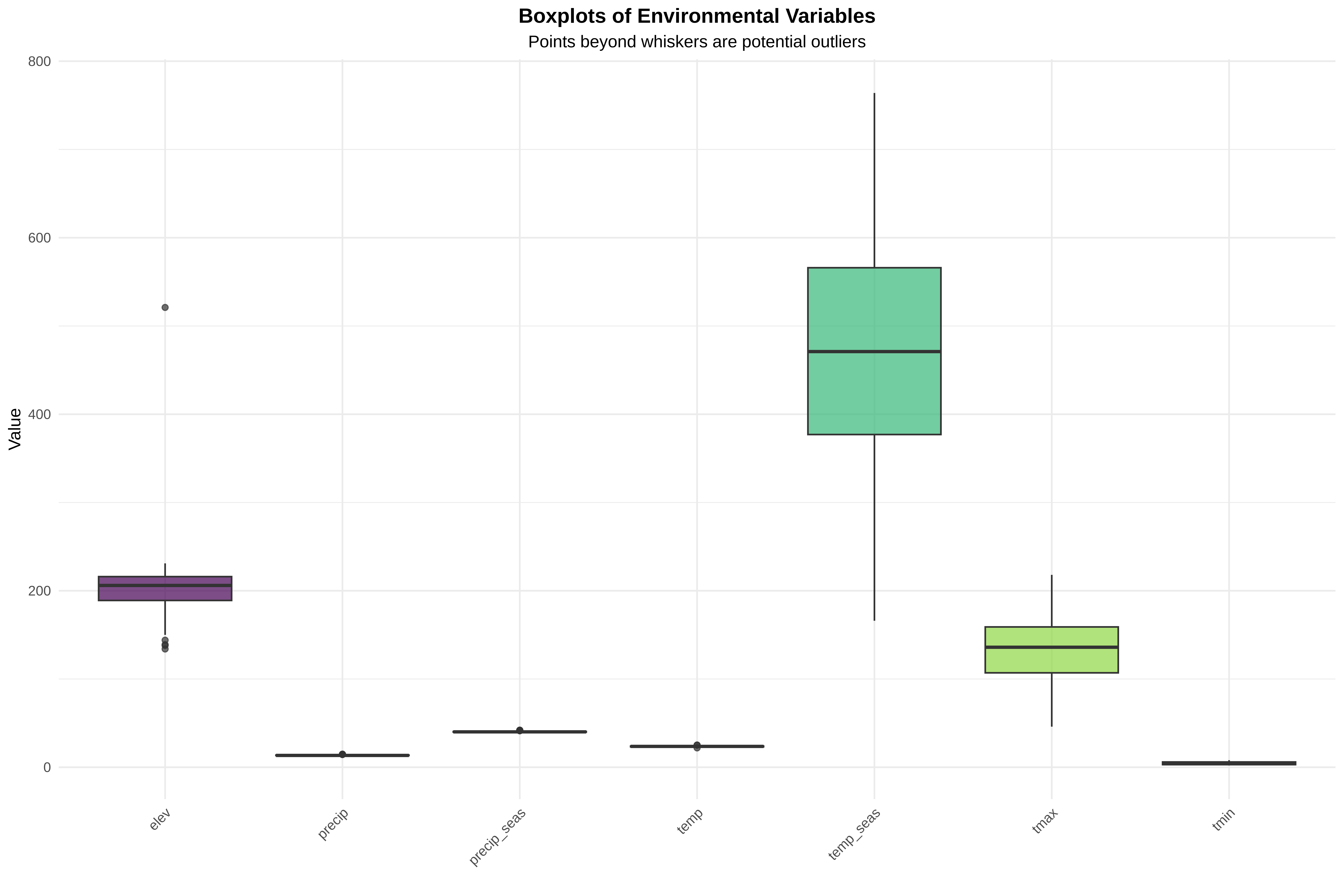 cat("\n=== CREATING BOXPLOTS ===\n")cat("Boxplots show median, quartiles, and potential outliers\n")cat("Points beyond whiskers are potential outliers\n")# Create boxplotsp_box <-ggplot(data_long, aes(x = variable, y = value, fill = variable)) +geom_boxplot(alpha =0.7) +scale_fill_viridis_d() +labs(title ="Boxplots of Environmental Variables",subtitle ="Points beyond whiskers are potential outliers",x ="", y ="Value" ) +theme_minimal() +theme(plot.title =element_text(hjust =0.5, face ="bold"),plot.subtitle =element_text(hjust =0.5),axis.text.x =element_text(angle =45, hjust =1),legend.position ="none" )print(p_box)