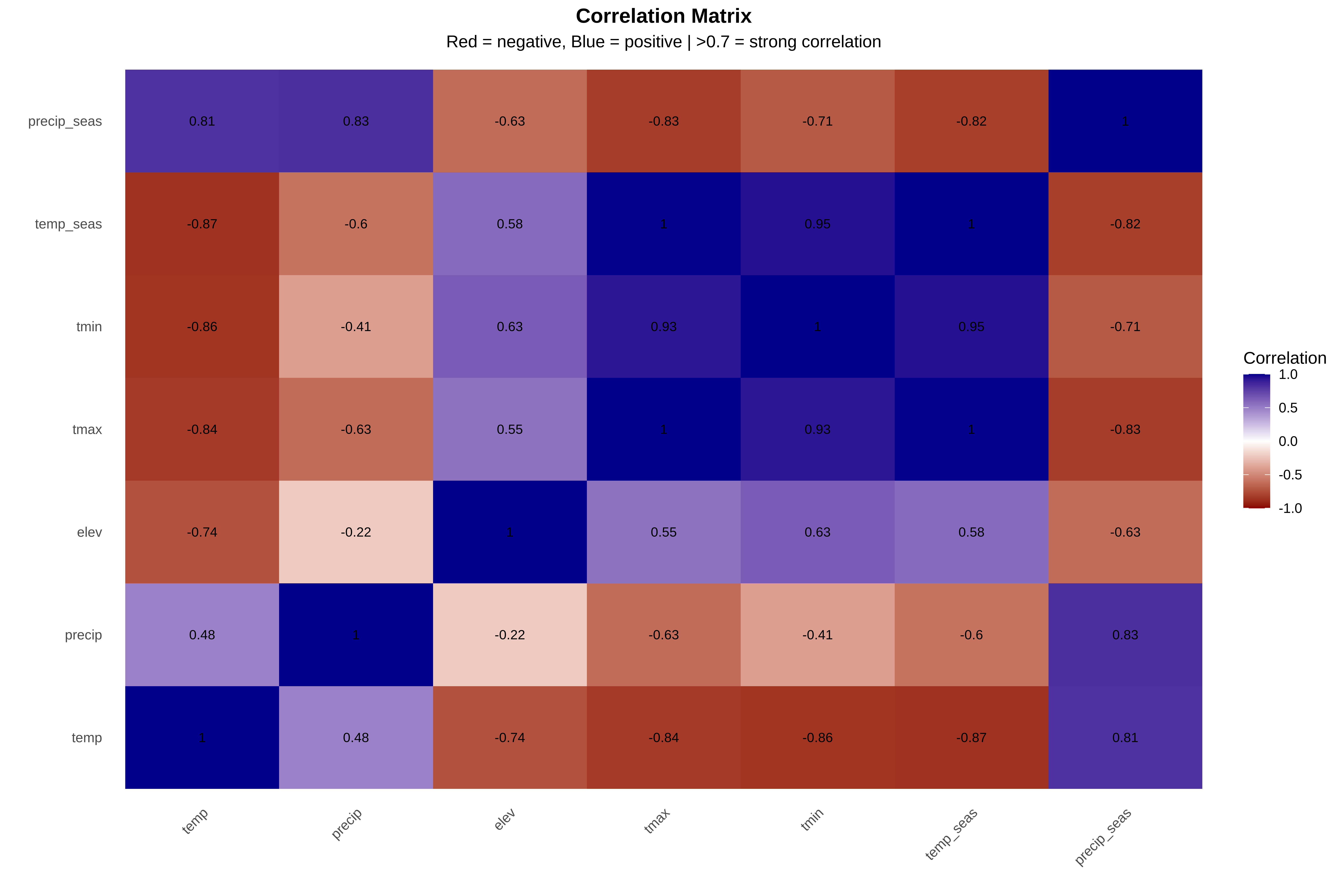 • tmax and temp_seas correlation = 0.996 (almost identical variables)