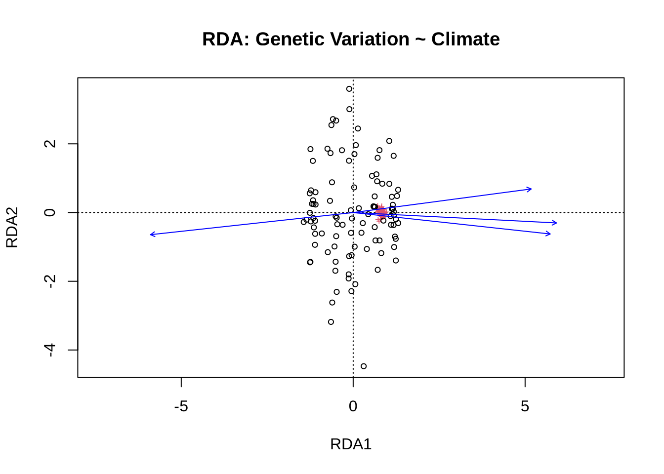 plot(rda_res, scaling = 2, main = "RDA: Genetic Variation ~ Climate")