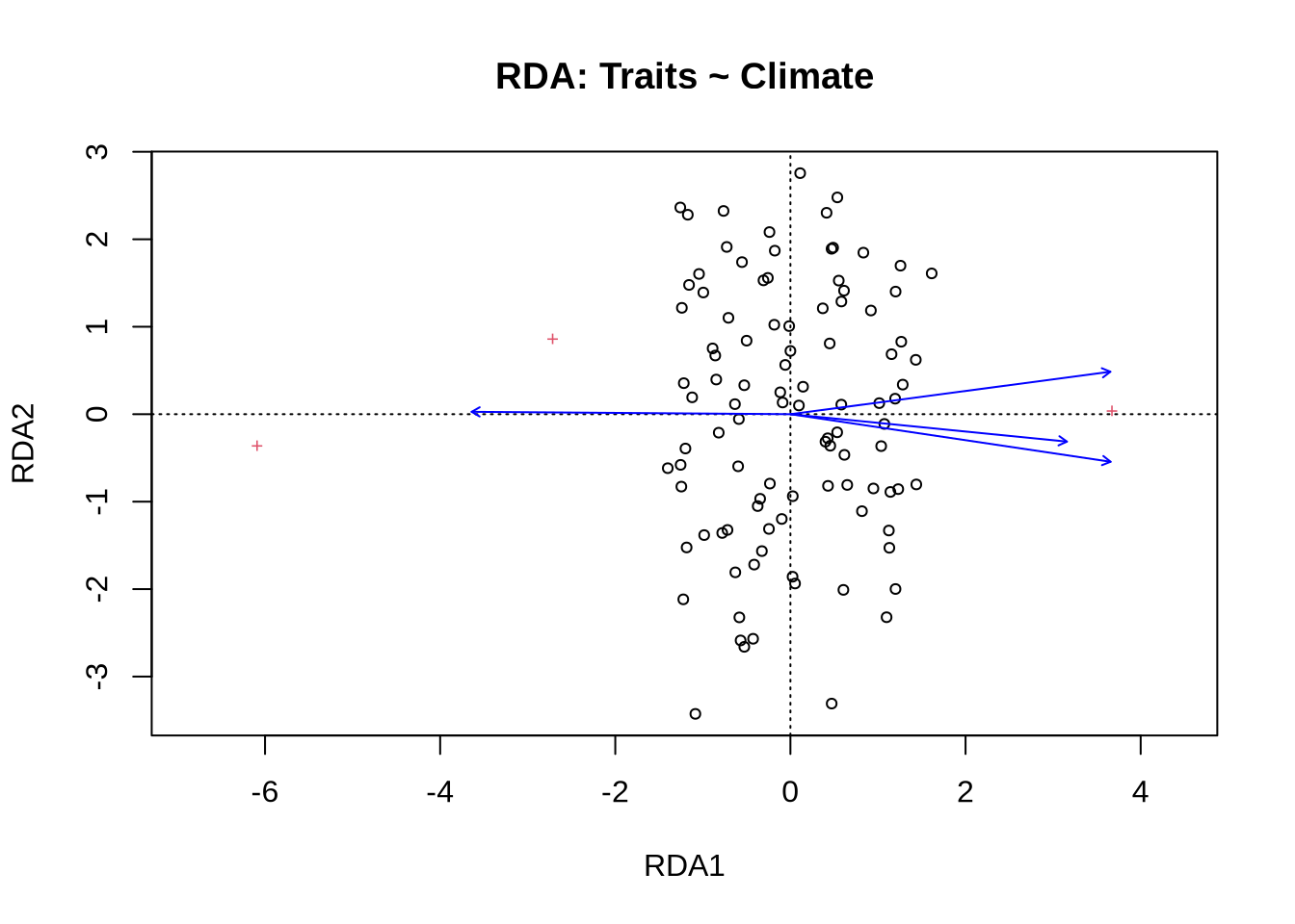 plot(rda_trait, scaling = 2, main = "RDA: Traits ~ Climate")